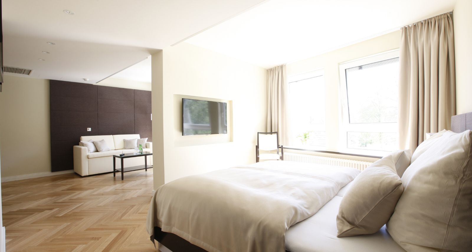 Die großzügigen, individuell gestalteten und lichtdurchfluteten Zimmer laden zum Wohlfühlen und Entspannen ein.